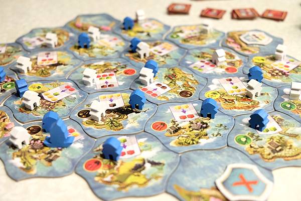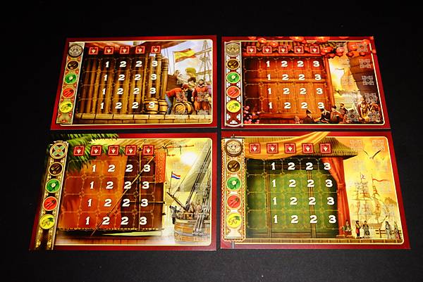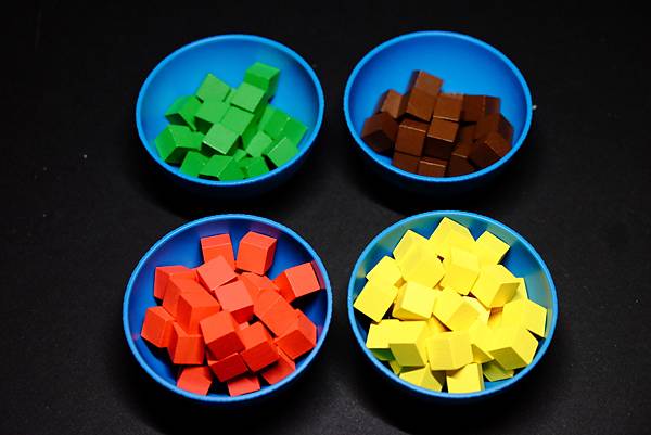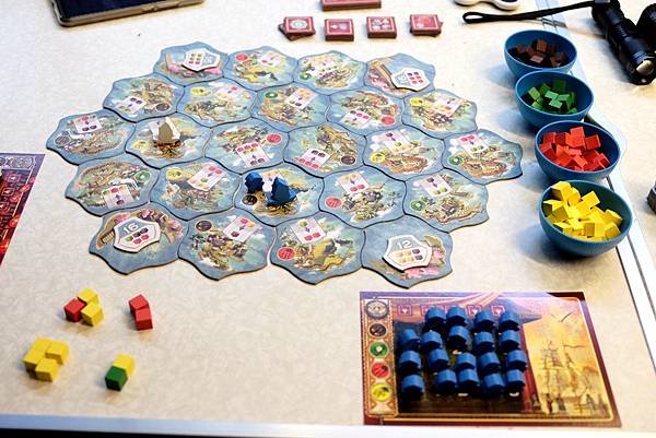 1.遊戲中的資源、船及貿易站等指示物都是木頭作的,質感不錯,還很貼心的為4種資源提供了4個塑膠小碗,讓你不用臨時另外找容器裝。整體遊戲的美術風格、板塊配件等質感也都很好,可算是一款賞新悅目的遊戲。另外這款遊戲的收納也要稱讚一下,基本上每樣配件都有他自己的收納位置,設計得還不錯。真要說缺點的話,就是個人圖板的表面有點太光滑了,當你把貿易站指示物滿滿的放在上面時,要小心千萬不要碰到圖板,因為只要輕輕一碰,圖板上的貿易站指示物馬上亂給你看。