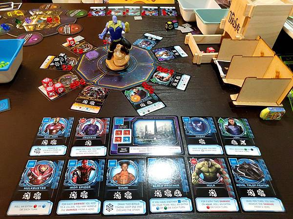 薩諾斯崛起是款合作遊戲,這款遊戲最吸引人的就是復仇者聯盟主題了,玩家要帶領復仇者聯盟各英雄來擊敗大魔王薩諾斯,遊戲不管是主題性、情境或是帶入感的體驗都非常的好,玩起來真的有置身於復仇者聯盟電影的fu。這也是一款骰子遊戲,所以遊戲骰運優先,策略度並不高,遊戲過程會感覺操作性高了點,但是遊戲樂趣沒有減少很多,如果你也是漫威迷,超推薦這款桌遊。