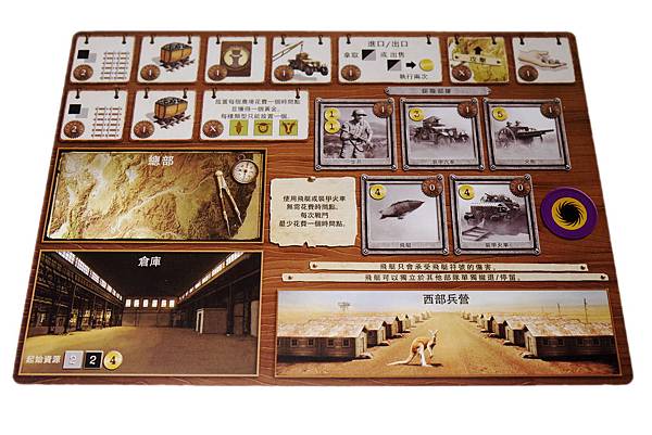 (6)進出口:可從供應堆中拿取1個煤礦或鐵礦;可將倉庫中的1個煤礦或鐵礦換成1個黃金,以上動作可執行2次。