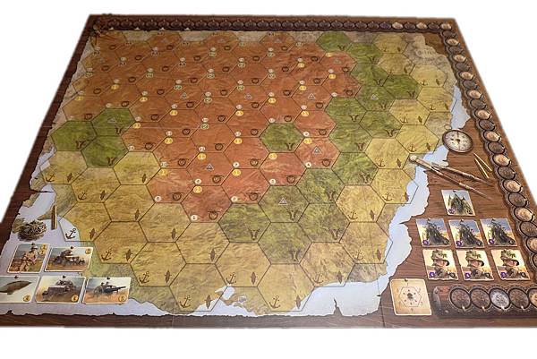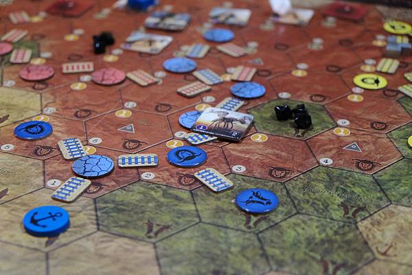 3.遊戲整體玩起來讓我想起以前很喜歡玩一款叫做"大戰略"的電玩,有點玩軍事戰棋的感覺,雖然圖版上沒有軍事單位模型,但透過鐵路的鋪設,還是有調兵遣將、移動布局的感覺。玩家需要適當規劃鐵路路線來開發資源及安排軍事單位,遊戲過程也具有4X(探索、擴張、開發、征服)的要素,但整個規則相對是比較簡單的。這樣的遊戲玩起來讓我感覺很有運籌帷幄之中,決勝千里之外的fu啊!