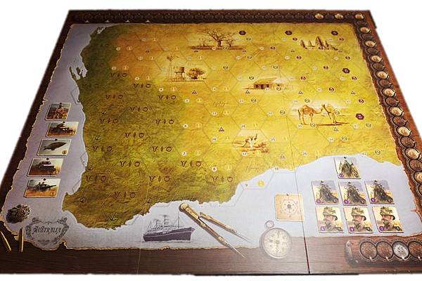 2.Martin Wallace設計的知名桌遊都有濃濃的鐵路風格,澳洲天劫這款桌遊也不例外,鐵路在這遊戲中也是很重要的一環,不論是開墾礦產、建設農場甚至打怪,都需要透過建設鐵路擴展領地才能達成。遊戲裡各項機制是環環相扣的,你必需建設鐵路才能擴張領地來建設農場(得分及獲得黃金)及採礦(可轉換成黃金或用來建設鐵路),而黃金可以讓你購買軍事單位用來打怪,怪物則會破壞你的農場跟港口。遊戲的主要操作就是蓋鐵路、拿資源、換黃金、買武器、打怪物,更簡單的來説就是一款開火車去打怪的神奇遊戲。