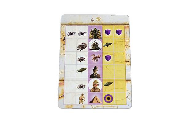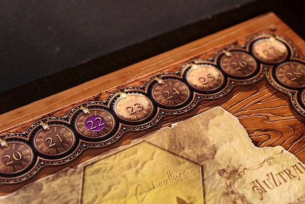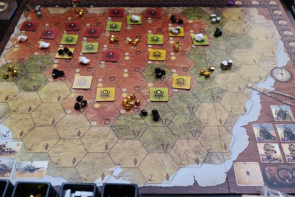 5.玩家行動的順序類似東海道或是拼布對決,由位於時間軌最後面的玩家先行動,所以玩家有可能可以連續行動多次,也可能需等待很久。遊戲裡玩家執行每項行動都需要耗費時間,這樣的設計非常貼近現實,而且這遊戲最特別的設計是怪物行動的回合,當所有玩家通過其在時間軌上的位置(第22格)後,怪物才會開始加入行動,因此隨著時間的流逝,玩家在執行行動時會產生一些時間上的壓力,這樣的設計也相當符合遊戲主題。想像一下,人類一到新大陸建立港口當據點後,即開始建築鐵路、開墾農場、採礦,行有餘力時就招募軍隊,當人類經過一段時間的開發後,沉潛在新大陸的怪物們突然開始反撲了,而且力道非常兇猛,所以前期沒做好該有的準備,後期可是會分身乏術的。