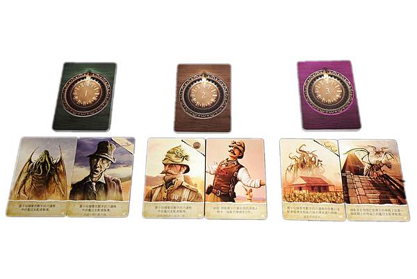 ∆遊戲裡的啟示牌,只有當舊日支配者圓片移動到發亮的時間格時才需翻開卡牌執行。